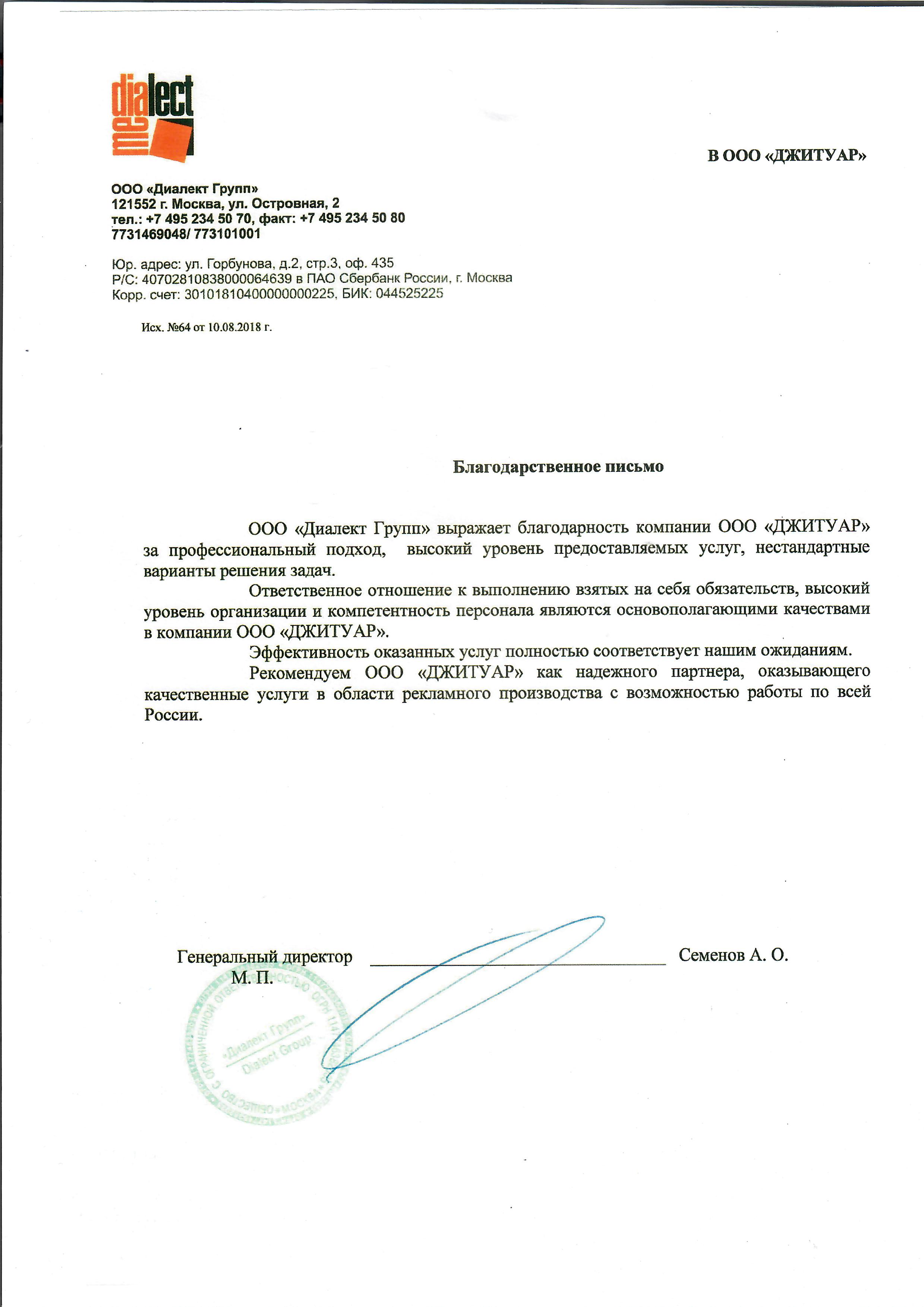 Благодарственное письмо от ООО Диалект Групп